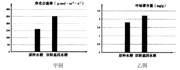 13.为探究C4植物中的PEPC酶和PPDK酶能否提高C3植物光合作用的效率,研究者将玉米的PEPC酶基因和PPDK酶基因导入水稻后,在灌浆期一定的CO2浓度条件下,分别测定了双转基因水稻和原种水稻的叶绿素含量及净光合速率,结果如下图所示,下列分析不正确的是( )