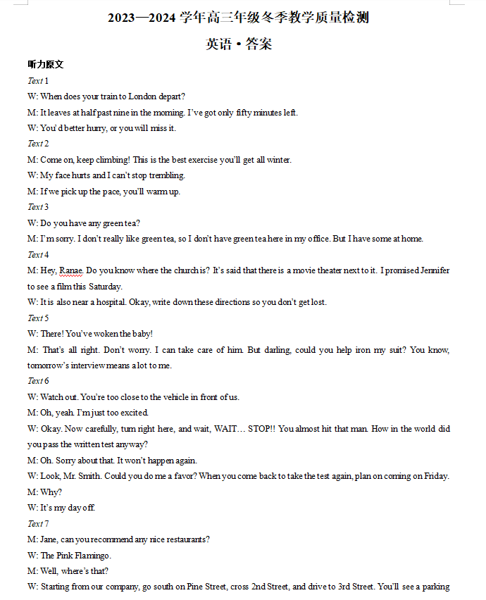 天一大联考2023-2024学年高三上学期冬季教学质量检测 英语答案