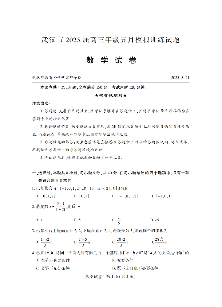 2026-01-14阅读全文 >>2025届高中毕业生五月模拟训练试题湖北省武汉市 数学试卷青春最大的遗憾不是 “我不行”,而是 “我本可以”。现在拼尽全力,日后才能说一句:“我没有辜负自己。”在此向大家2025届···