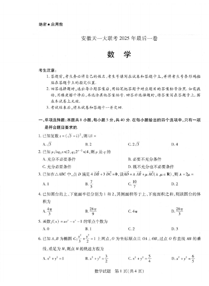 天一大联考高三下学期最后一卷(全科)2025届安徽省 数学试卷人生没有重启键,但有无数次弯道超车的机会。抓住当下,用知识武装自己,你随时可以逆风翻盘。在此向大家分享天一大联考高三下···